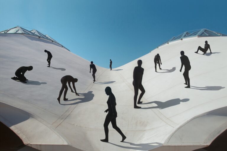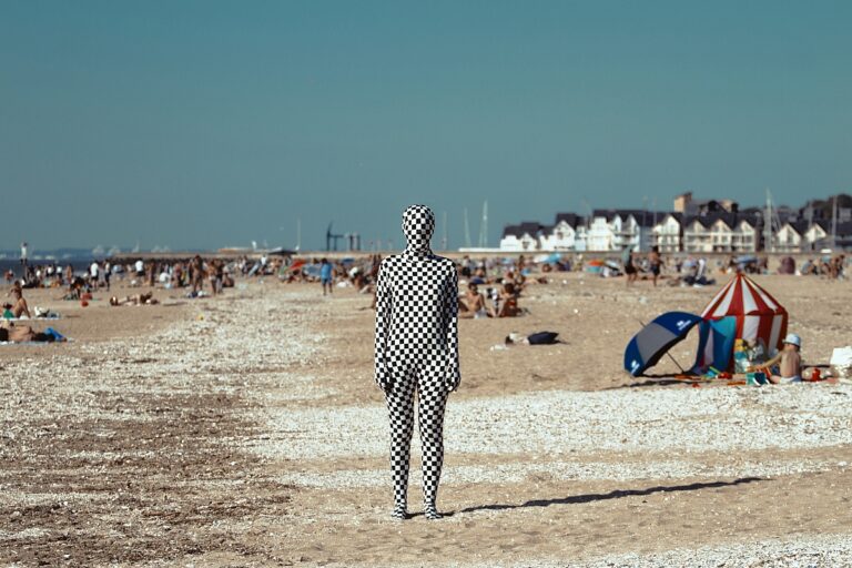 I decided to express the strange–stranger binomial by wearing three costumes which would cover my whole body, head to toe. I was able to immerse myself in various locations of Deauville and interact with them both physically and emotionally. The houses, the beach, the Pompeian baths, the orphanage, they all seemed exotic to me and perhaps I was just as exotic to them. Through my “second skin” I could see only partially, like from within a veil, the faces of the people who passed by me – some smiling and perceiving me as a performer, while others – especially the crowds – simply minding their own way.